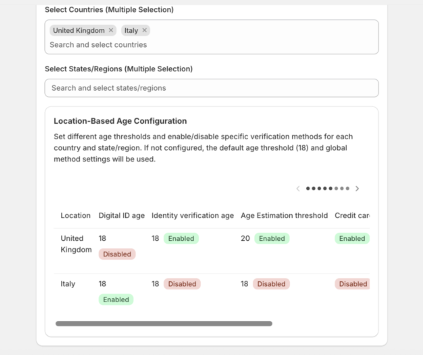 Configure country- and region-specific age verification rules by selecting which verification methods to enable or disable (Digital ID, Identity Verification, Age Estimation, etc.) and setting custom age thresholds for each method. This allows full control over how age checks are applied in different locations.