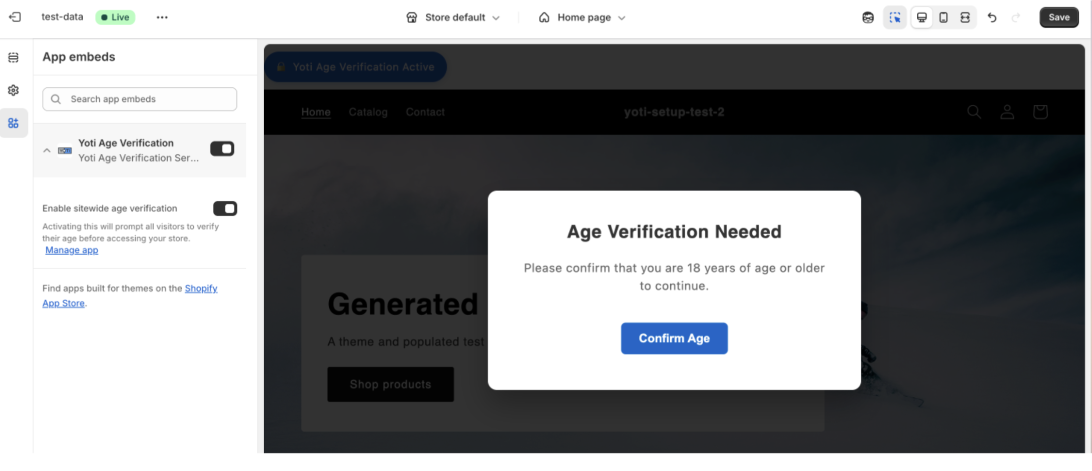 - This feature allows merchants to enable sitewide age verification through a pop-up that blocks access to the storefront until the customer successfully verifies their age.