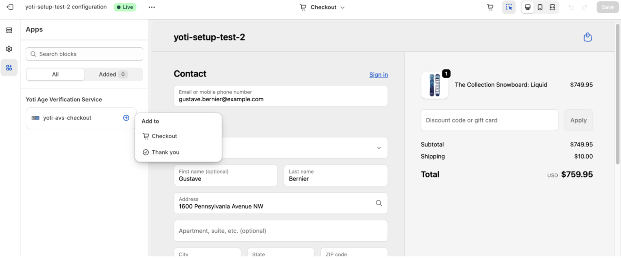 4. In the Shopify editor, under the Apps section, locate the yoti-avs-checkout block.