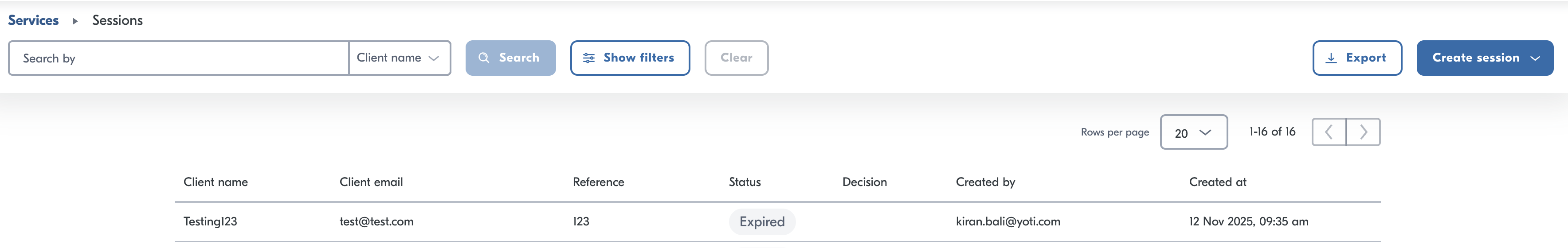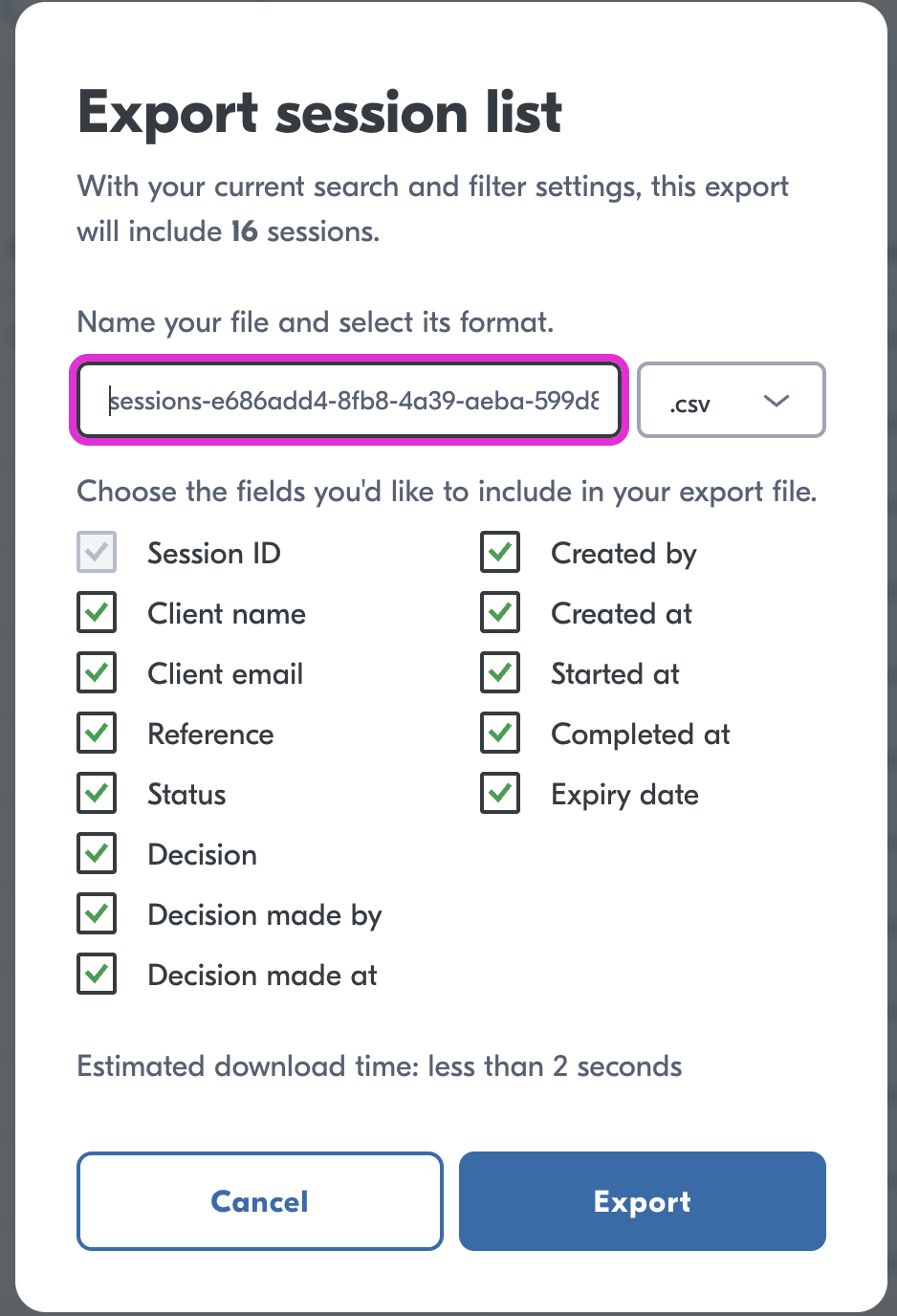 If you would like to export your IDV sessions, please see the Export button on the home screen of the IDV portal.