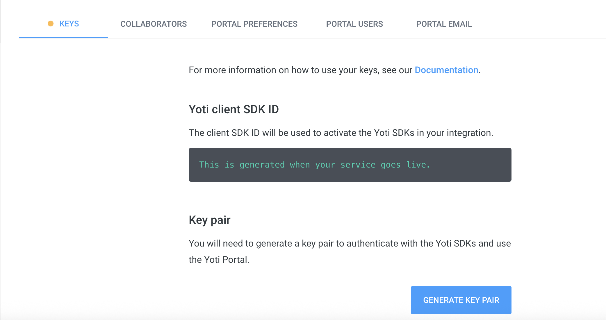 | Pem file | You need to download a PEM file containing your private key in order for your app to connect with Yoti. • Click the Generate key pair button in the Keys tab to download. • Please keep this safe as this PEM file is essential to a Yoti integration. If you lose or corrupt your PEM file you will be able to generate a new one. Regenerating your key pair will break your current service by invalidating your current PEM file and generated keys. This means you will be unable to decrypt new tokens until these are replaced by the newly generated ones. |