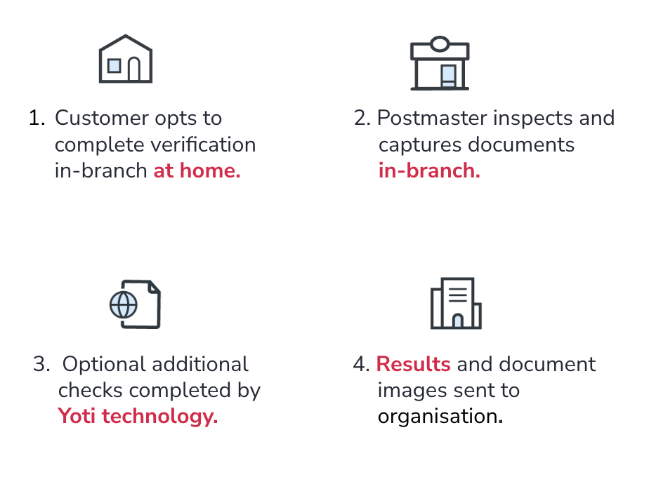 In-Branch Verification is a service for organisations that require In-person identity verification and document validation. This service will use Yoti's Identity verification capability combined with a face-to-face transaction to provide identity and proof of address document validation and identity verification to clients who require additional assurance to meet business risk or regulatory obligations, or to applicants who require the additional assistance that a branch can provide.